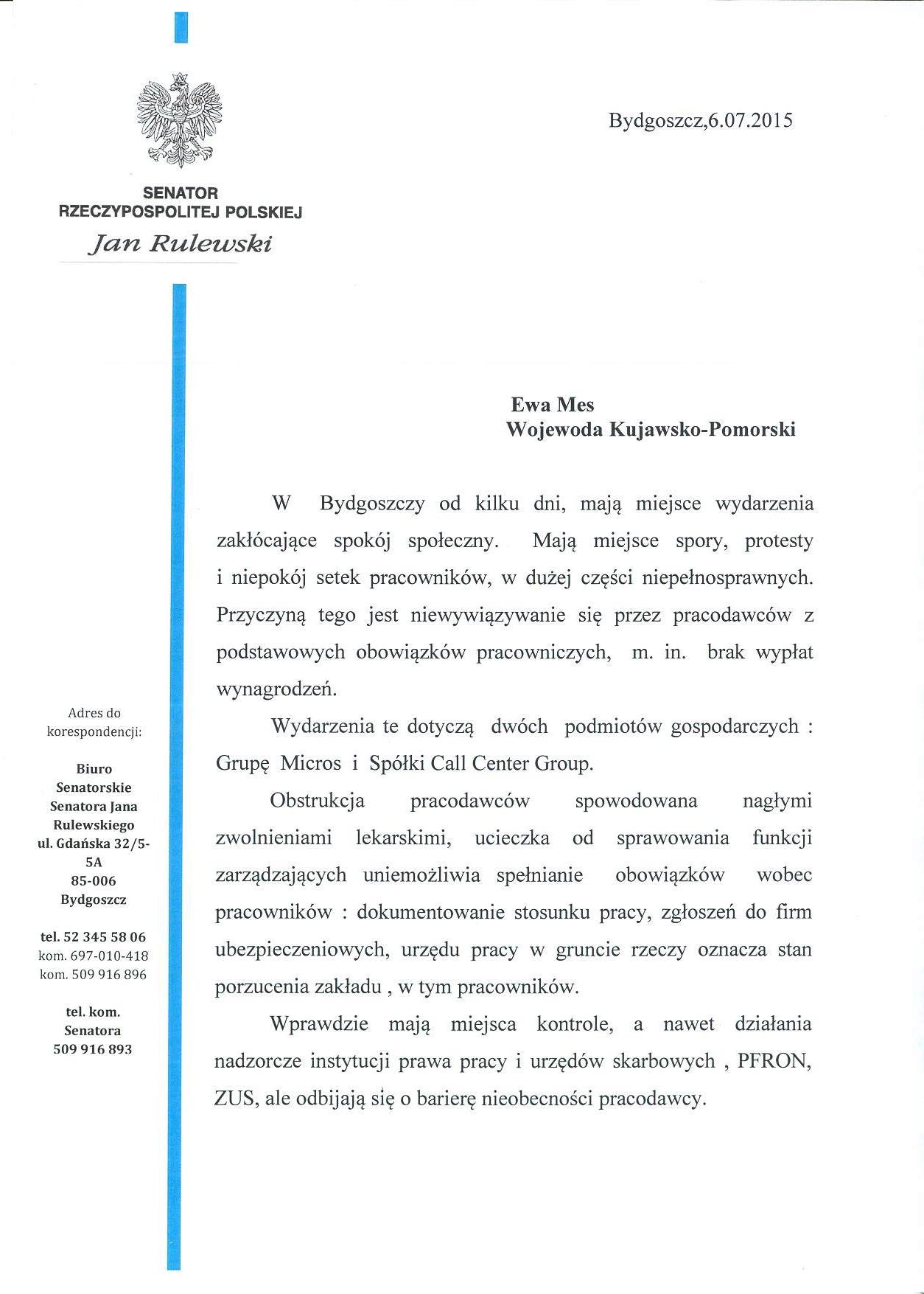 Reakcja senatora na problem ponad 100 osób zatrudnionych w spółce Call Center Group i Firmie Micros