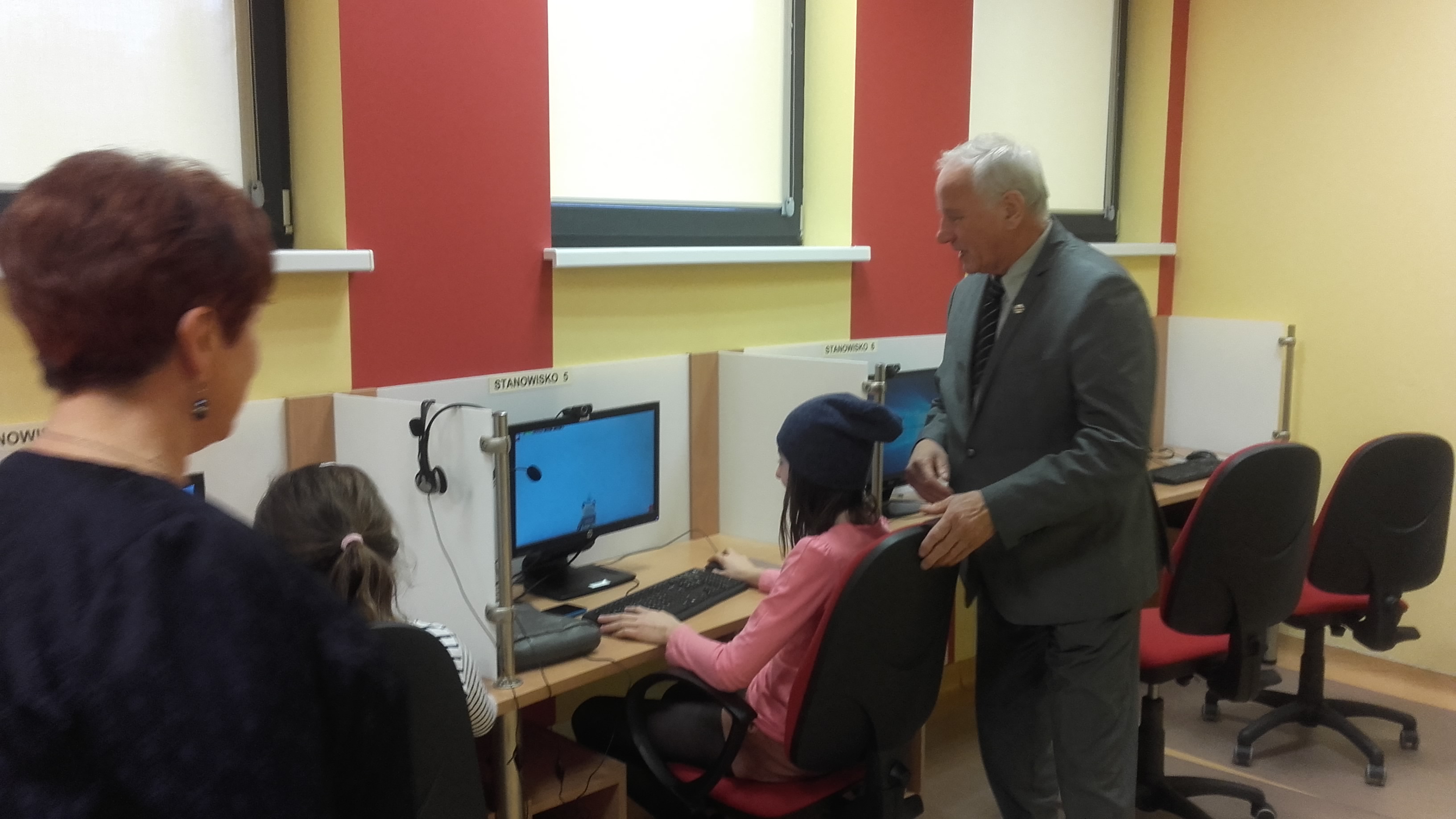 Podczas wizyty w bibliotece, Senator został oprowadzony po budynku przez Panią dyrektor. W czasie zwiedzania były prowadzone zajęcia w sali komputerowej.