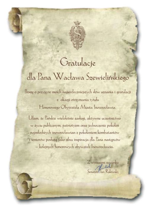 W sali sesyjnej ratusza 6 października podczas uroczystej sesji Rady Miasta w Inowrocławiu, wśród licznie zgromadzonych gości, kapitan Wacław Szewieliński, żołnierz Armii Krajowej „Zawisza” i kpt. Wojska Polskiego w stanie spoczynku otrzymał tytuł Honorowego Obywatela Miasta Inowrocławia. Wacław Szewieliński urodził się 1 grudnia 1920r. w miejscowości Wojckuny - gm. Podbrodzie. Do Inowrocławia przybył z wileńskich Kresów w 1945 roku i to właśnie tutaj znalazł „swoje miejsce na ziemi".