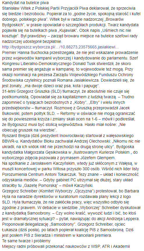 niedziela, 26 sierpnia 2018Jubileuszowe ,gdyż 10 spotkanie w Przysieku,zorganizowane przez Marszałka PO Całbeckiego.Obecni to w 80 procentach wiara spod znaku PIS,łącznie z ministrem Ardanowskim,wojewodą Ramlauem.Dla swojej poprawności podkreślali sukcesy dobrej zmiany i błędy PO.Ale bywało w rozmowach gorzej.Nie wszystkich traktowano poważnie i na miarę Solidarności,chyba ,tej że tej ze znaczkiem +.Ale było uroczyście / Filharmonia z Kolęda Nocką,w wykonaniu młodych artystów.A generał Nowek z uroczym wspomnieniem epizodu z walki o Lwów/opis szarży orląt pod Zadworzem/.Solidarności jakby mniej ,chyba,że dowodziły o tym kolejne edycje odznaczeń.Wszyscy byli zgodni ,że należy się podziękowanie marszałkowi,co uczynił pięknie Jan Wyrowiński.Ciekawostką, była dla mnie kaczyńska metamorfoza ministra Ardanowskiego .Nie chciał rozmawiać z solidaruchami spod znaku KOD.A jeszcze niedawno zdawało mi się,że Solidarność żyje i nie prześladuje się za znaczek.