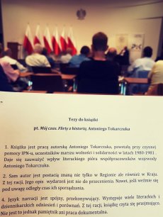 piątek, 1 września 2017W sali konferencyjnej Kujawsko-Pomorskiego Urzędu Wojewódzkiego w Bydgoszczy w dniu 37. rocznicy Porozumień Sierpniowych odbyło się spotkanie autorskie z Antonim Tokarczukiem. Były minister, senator, poseł, wojewoda i działacz NSZZ "Solidarność" promował swoją książkę "Mój czas. Flirty z historią".