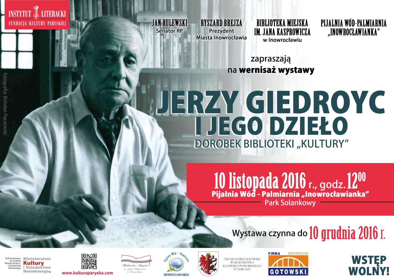 Dnia 10 listopada o godz. 12.00 w Pijalni Wód - Palmiarni "Inowrocławianka" zostanie otwarta ekspozycja pt. "Jerzy Giedroyc i jego dzieło" . Wystawa - prezentująca ważną część dziedzictwa publicysty i Instytutu Literackiego - powstała w 60. rocznicę ukazania się pierwszych publikacji w ramach serii wydawniczej Biblioteka "KULTURY", jednej z najważniejszych kolekcji w dziejach kultury polskiej po II wojnie światowej.