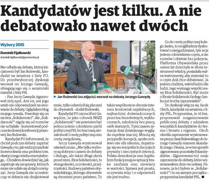 wtorek, 20 października 2015To już ostatnie dni kampanii wyborczej. Senator Jan Rulewski odwiedzając region spotyka się z mieszkańcami miast, miasteczek i wsi. Dobra atmosfera i życzliwe przyjęcie pomimo chwilami niesprzyjającej aury towarzyszą bezpośredniemu kontaktowi z mieszkańcami regionu. Niejednokrotnie ludzie ochoczo włączali się w akcję wbijania „potykaczy” i zdecydowanie deklarowali swe głosy poparcia. Wyrazy sympatii i dobra energia towarzyszą na każdym kroku. Senator Jan Rulewski będąc w terenie odwiedził już m.in. Inowrocław, Żnin, Gniewkowo, Janowiec Wielkopolski, Kowalewo, Szubin, Kcynię, Paterek, Mroczę, Więcbork, Sępólno Krajeńskie, Kamień Krajeński, Złotniki Kujawskie, Strzelno, Kruszwicę, Pakość.