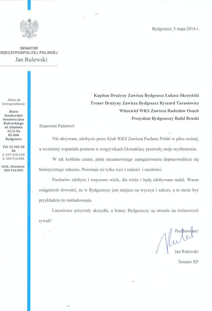 Gratulacje dla drużyny Zawisza Bydgoszcz za zdobycie Pucharu Polski w piłce nożnej