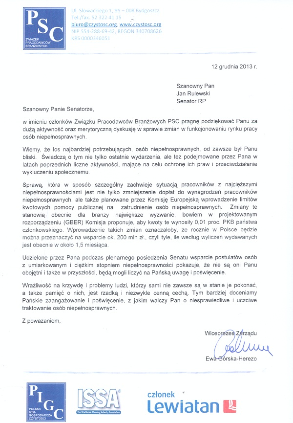 Podziękowanie od Związku Pracodawców Branżowych PSC