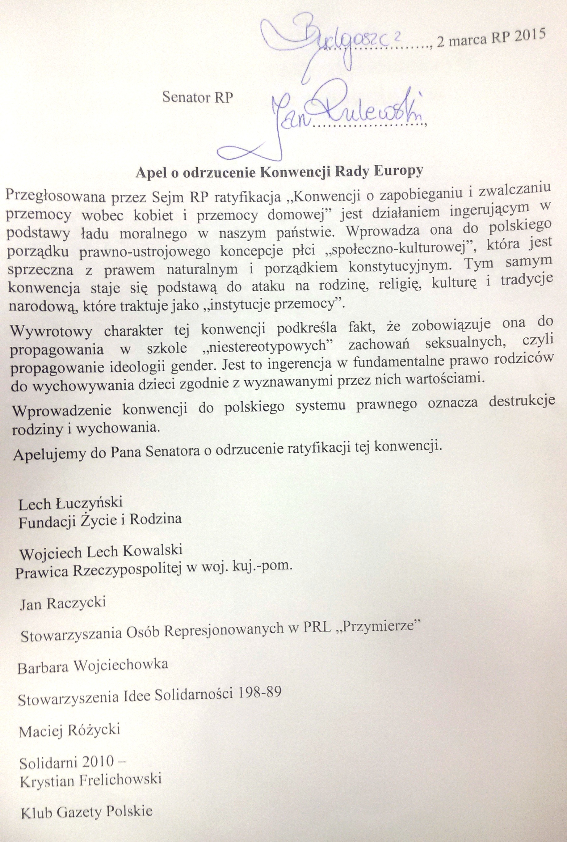 Dziś, (2 marca 2015 r.) do biura Senatora Jana Rulewskiego przyszła spora grupa osób aby wręczyć Senatorowi „Apel o odrzucenie Konwencji Rady Europy” podpisany przez organizacje, stowarzyszenia oraz osoby indywidualne.