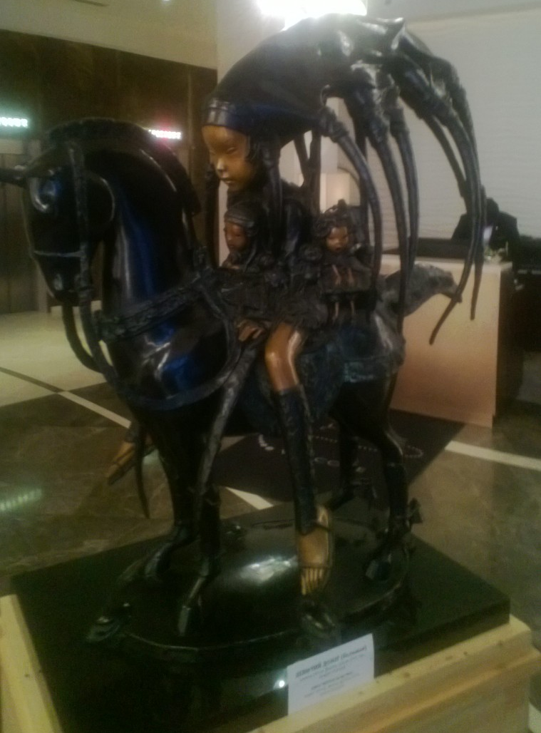 W hotelu, w którym gości nas OBWE, zainteresowanie wzbudza mosiężna rzeźba. Tytuł to „Opieka macierzyńska”. Rzeczywiście gromadkę przerażonych dzieci na koniu z rogiem otacza postać kobiety. Tyle, że na głowie włosy stanowią olbrzymie krogulce wcinające się w dzieci. Nie wiem czy w ten osób rzeźbiarz nie oddał tego co od wielu lat dzieje się na Białorusi? Łukaszenko to owa matka, która ochrania Białorusinów, ale dzieci nie wiedzą, że jej postać, a zwłaszcza co ma w głowie, zgoła nie przypomina macierzyństwa.