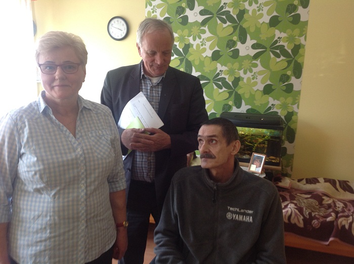 Od lewej: Pani Teresa Barbużyńska, Senator Jan Rulewski oraz jeden z podopiecznych, Pan Henryk Trzciński