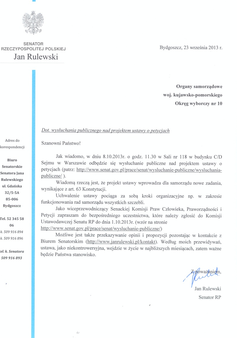 W związku z wysłuchaniem publicznym Senator wystosował list do rad powiatów, miast i gmin na terenie okręgu wyborczego nr 10, zachęcający do zgłaszania uczestnictwa.