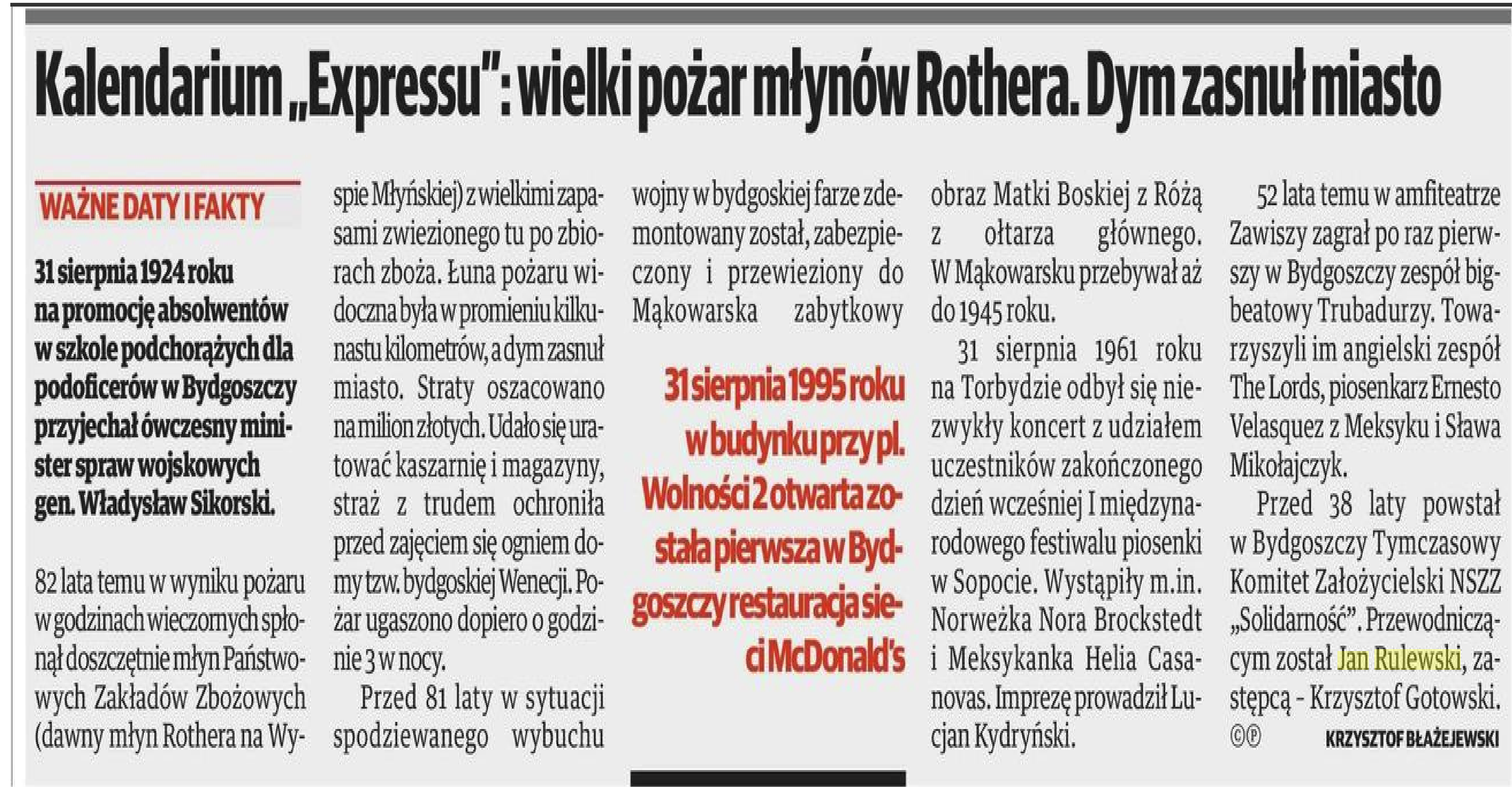31.08.2018 - Kalendarium expressu: Wielki pożar młynów Rothera. Wydawnictwo : Express Bydgoszcz