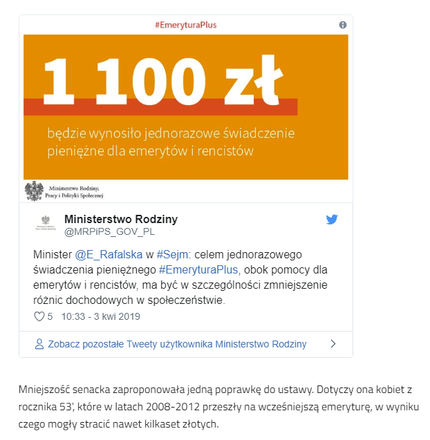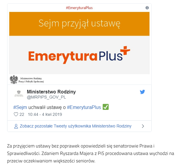 11.04.2019-Senacka komisja rekomenduje Emeryturę plus bez poprawek.Wydawnictwo : Polskie Radio